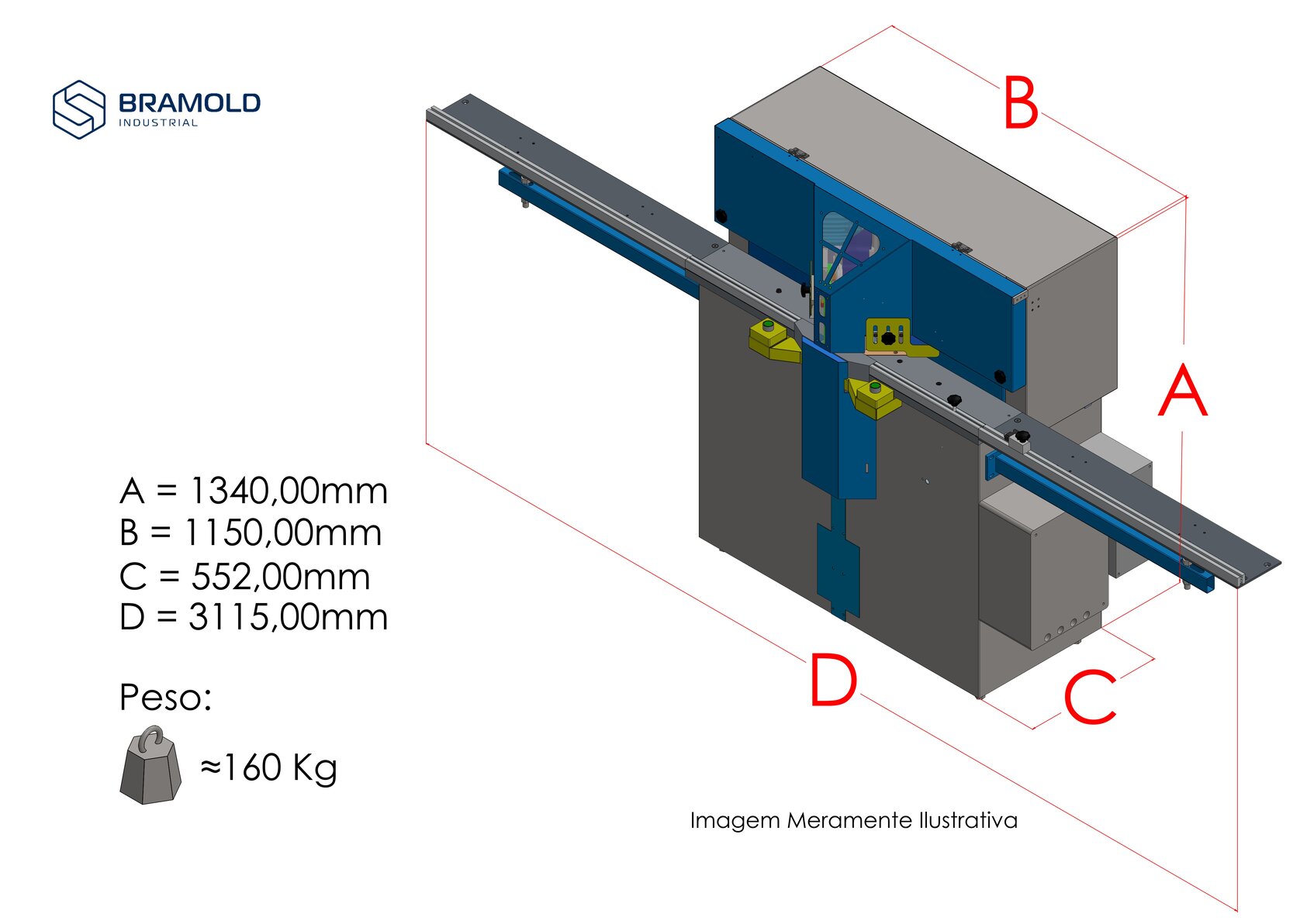 La máquina de corte Bramold® modelo MCBR-300-PE fue diseñada para realizar cortes a 45° en perfiles de madera y plástico de forma rápida, precisa y con un acabado perfecto. Lleva incorporado: sistema de recogida de polvo, prensador de perfiles neumático, básculas diagramadas en acero inoxidable, tope móvil, sistema de monitorización de apertura de puerta, cerradura de puerta, interruptor general, válvula de descompresión de red, pulsador de emergencia, mando a distancia eléctrico a dos manos y extensiones adicionales (opcionales). También dispone de prensas frontales, utilizadas para cortar perfiles altos (opcional). Se activa presionando simultáneamente los botones de la máquina eléctrica a dos manos, bajando los prensadores y luego bajando simultáneamente las hojas de sierra circular, garantizando mayor agilidad y seguridad en la producción.